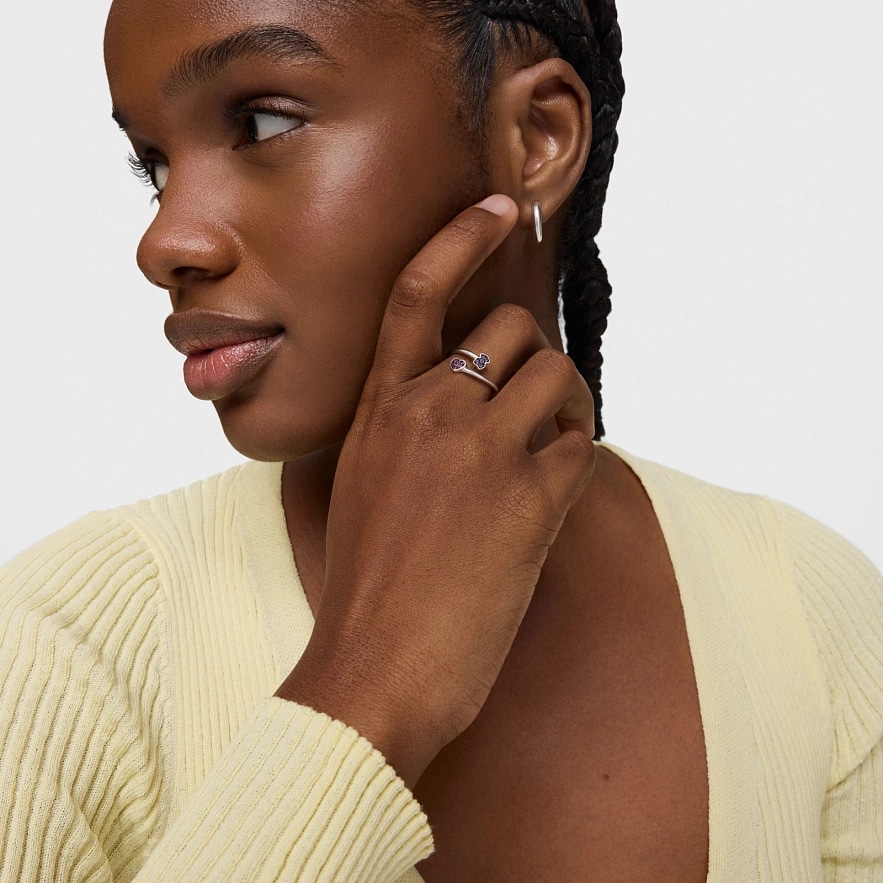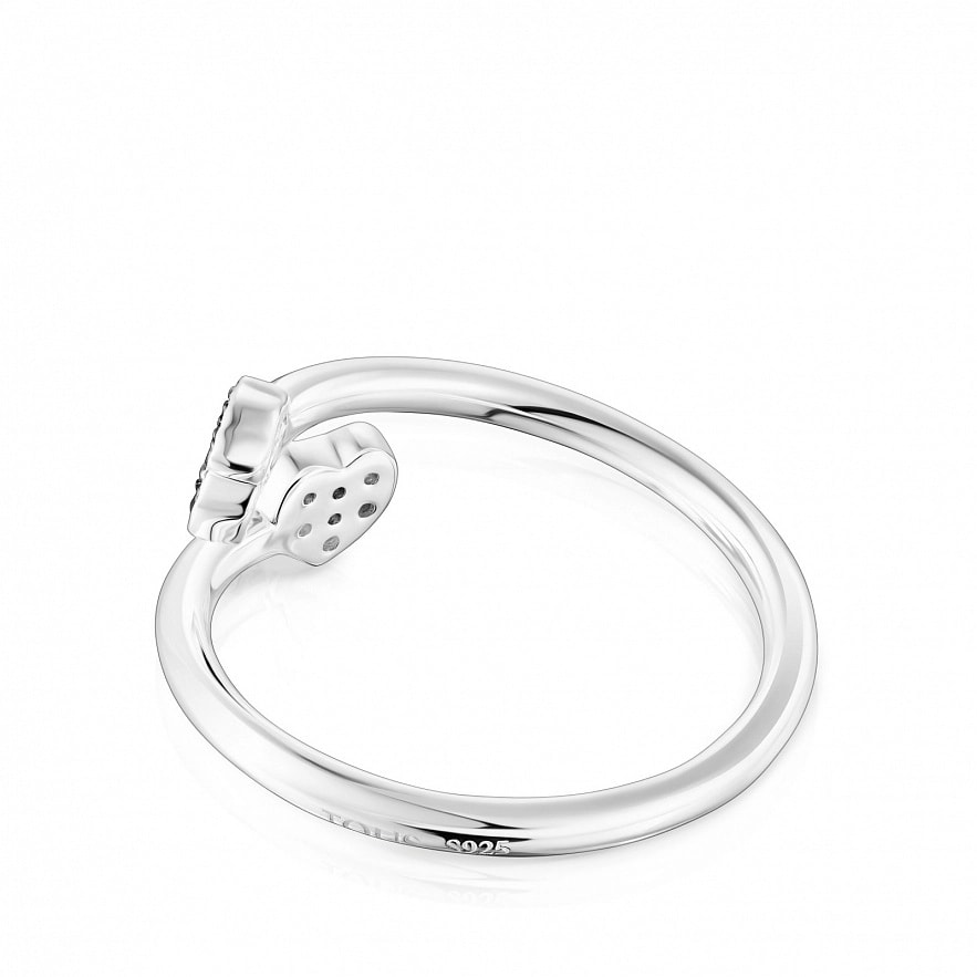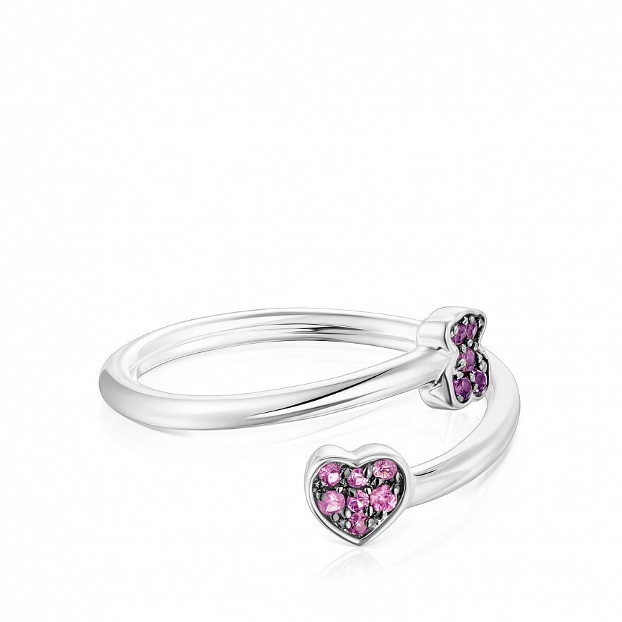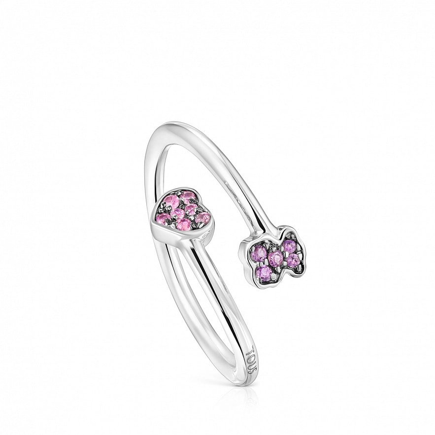 Каблучка TOUS New Motif зі срібла 925 проби з рожевими сапфірами розміром 4,4 мм х 4,6 мм у формі серця і ведмедиком в аметистах розміром 4,6 мм х 3,8 мм. Товщина каблучки: 1,5 мм.