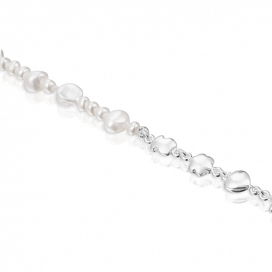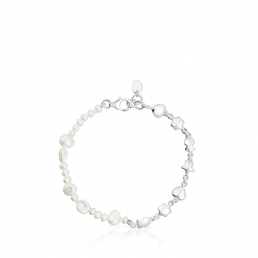 TOUS Mini Icons браслет зі срібла 925 проби з ведмедиком, квіткою, серцем і зіркою на одній половині: 5-6мм. На іншій половині — культивовані прісноводні перлини різного розміру: 3,5мм, 7мм і 9мм. Довжина: 17,5см. Застібка лобстер.