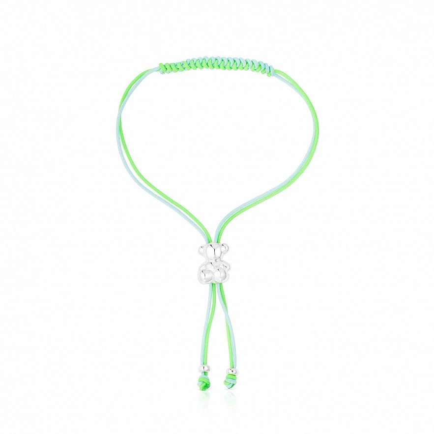 Браслет TOUS Bold Bear із двома переплетеними поліестеровими шнурами неоново-зеленого та небесно-блакитного кольорів із ведмедиком. Розмір ведмедика: 11 мм. Загальна довжина: 22 см. Розсувна застібка-ведмедик.