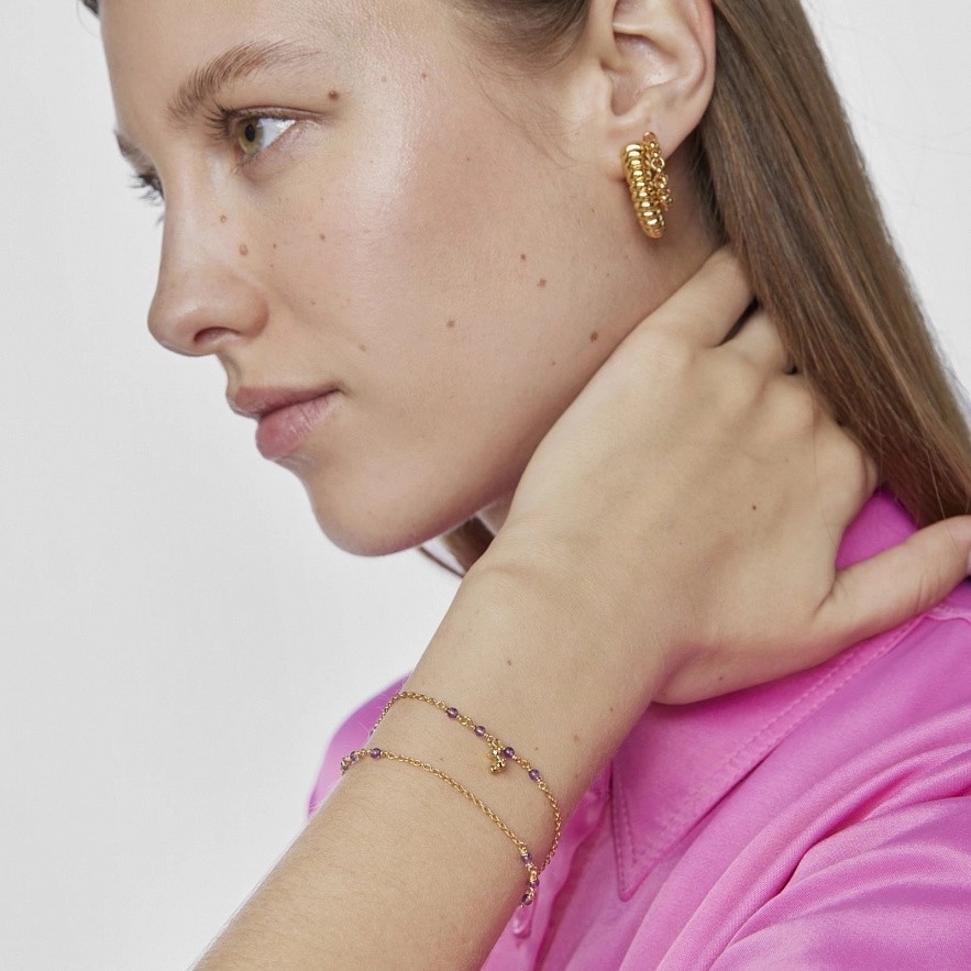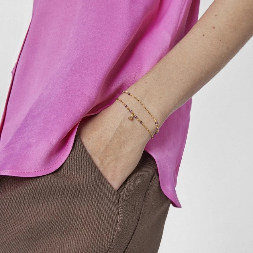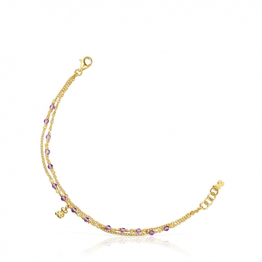 TOUS Bold Bear браслет зі срібла 925 проби з покриттям Vermeil та аметисту, що складається з двох ланцюжків, які з’єднані на кінцях, одна з яких має срібну підвіску у вигляді ведмедя зі срібла 925 проби з покриттям Vermeil . Розмір дорогоцінних каменів: 2-2,5мм. Розмір ведмедика: 5,35мм. Довжина браслета: 17,5см. Застібка-лобстер.