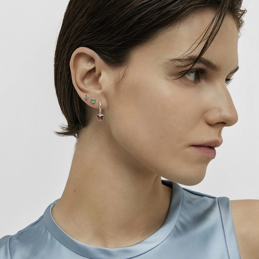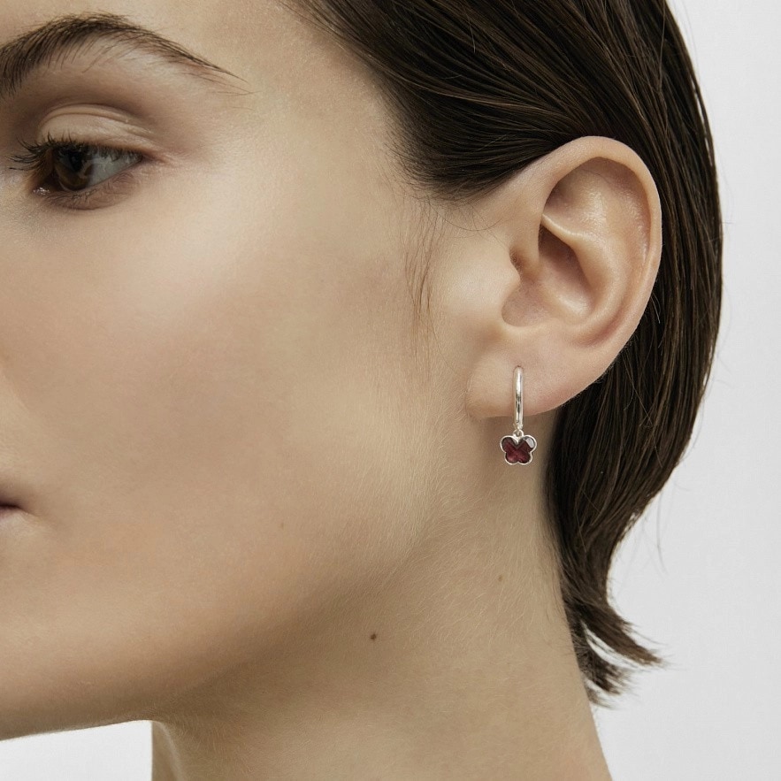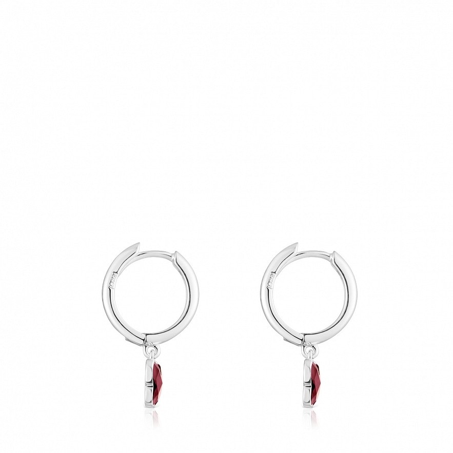 Сережки-кільця TOUS Bold Motif із стерлінгового срібла та мотивом метелика з гранованим кабошоном із родоліту розміром 5,4 мм. Внутрішній діаметр: 10 мм. Розмір метелика: 6 мм. Приблизна довжина сережки: 20 мм.