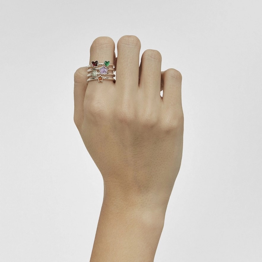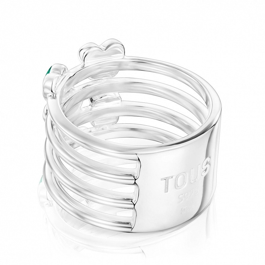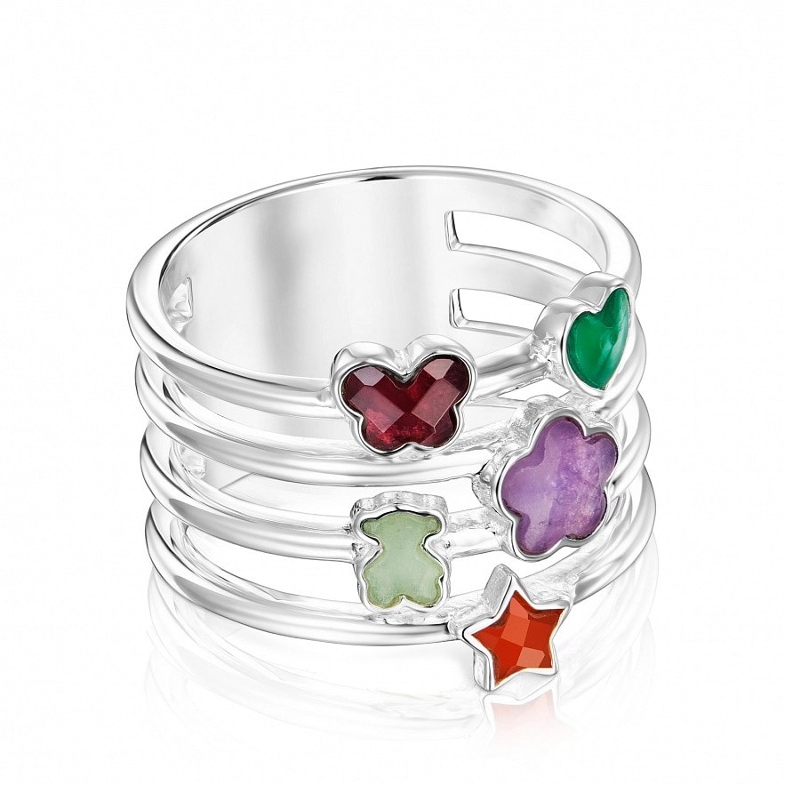 Широка каблучка TOUS Bold Motif зі срібла 925 проби з мотивами та дорогоцінним камінням на внутрішній стороні силуетів. Розмір дорогоцінних каменів: аметистовий кабошон (квітка) 5,6 мм, оброблений халцедон 4 мм (серце), сердолік огранований кабошон 4 мм (зірочка), амазонітовий кабошон 4 мм (ведмідь) і огранений родолітовий кабошон 4 мм. (метелик). Ширина каблучки: 19 мм. Товщина каблучки: 1,5 мм.