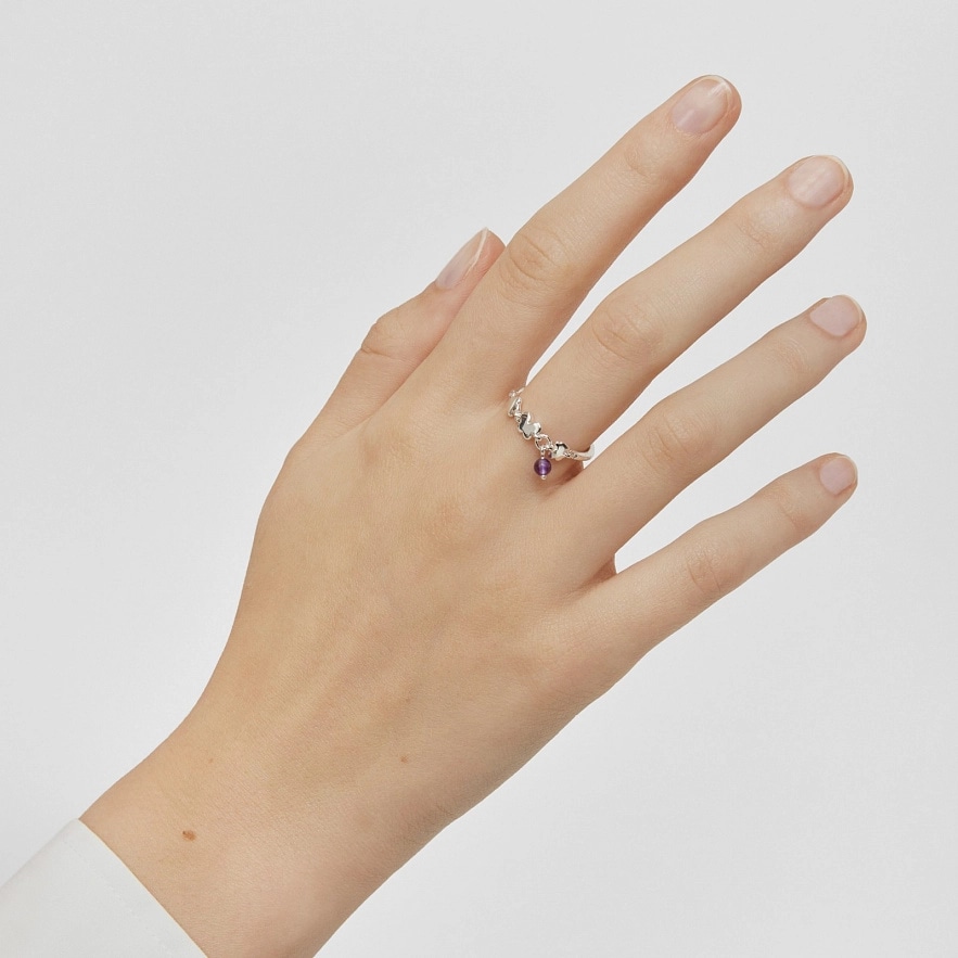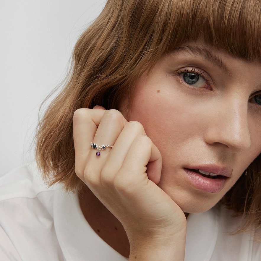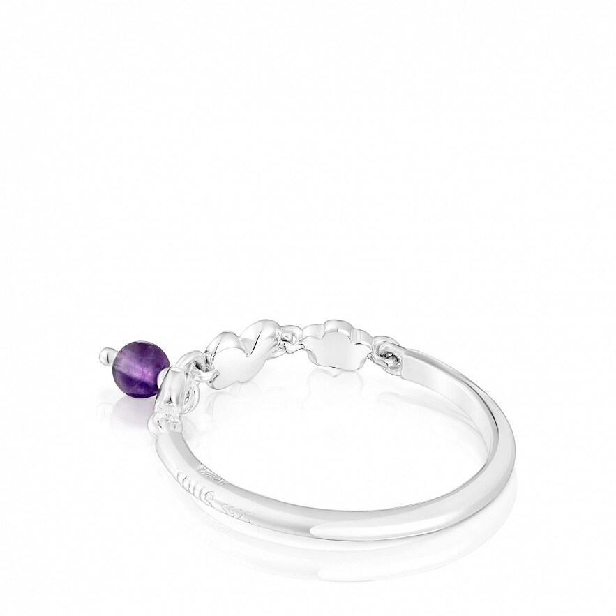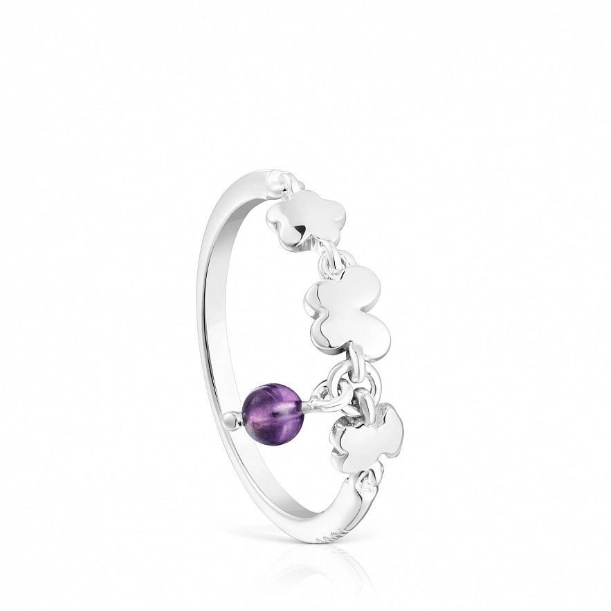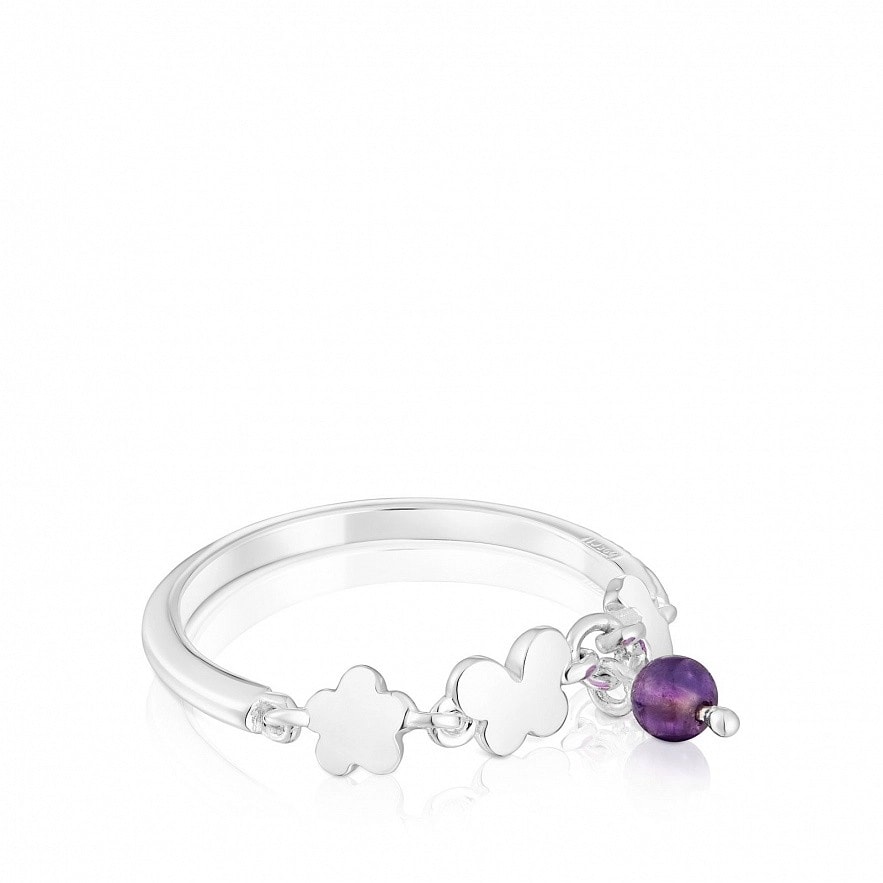Каблучка TOUS Bold Motif із стерлінгового срібла з мотивами та деталлю з аметисту діаметром 3 мм. Мотиви: ведмідь, метелик, квітка. Розмір мотивів: 4 мм. Товщина каблучки: 1,5 мм.