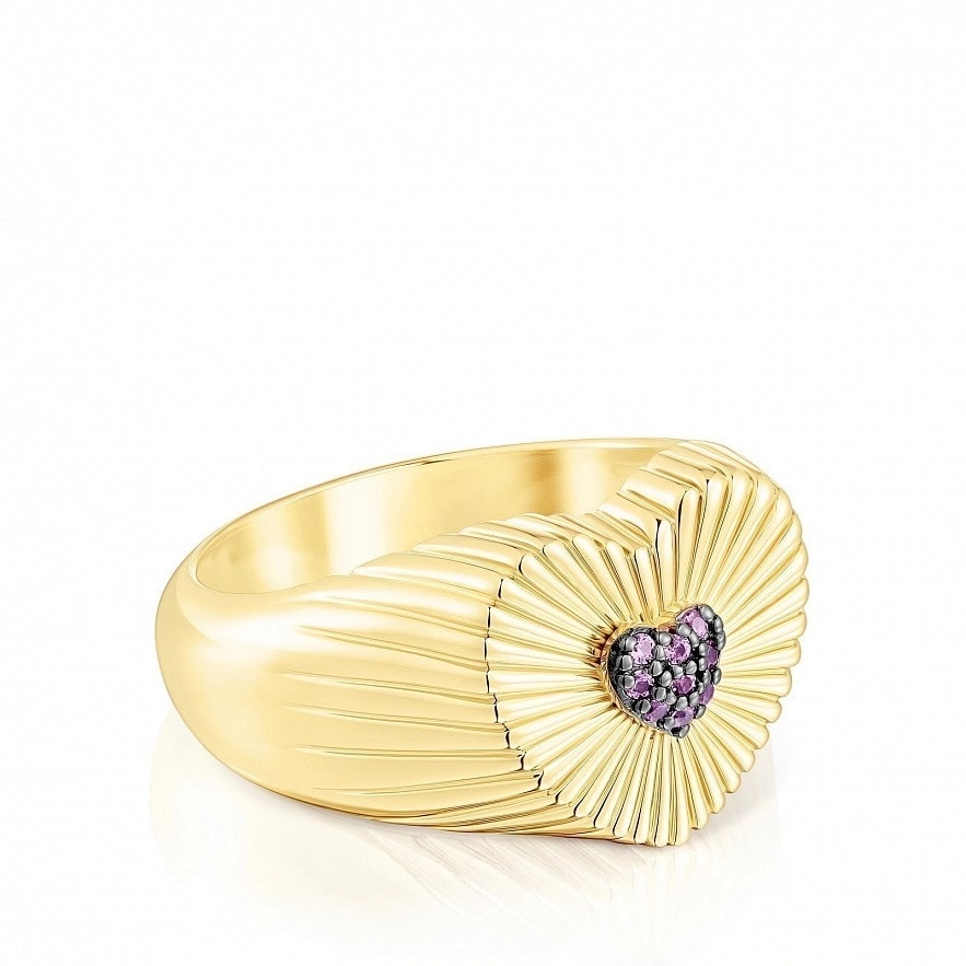 TOUS Iris Motif перстень із печаткою зі срібла 925 проби з покриттям Vermeil з силуетом серця та іншим серцем у центрі з родолітом. Розмір мотиву серця 4,2мм. Верхня ширина: 12мм. Нижня ширина: 7,5мм. Товщина каблучки: 3мм.