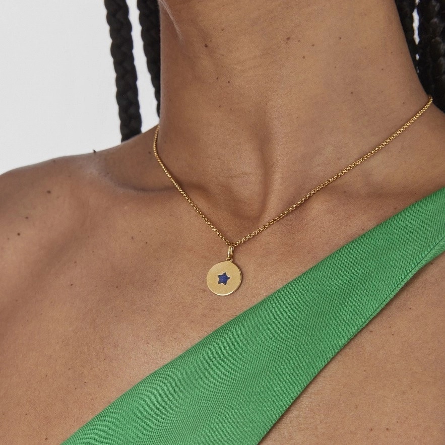 TOUS Aelita кулон-медальйон зі срібла 925 проби з покриттям Vermeil з гранованим зіркоподібним содалітом у центрі. Розмір дорогоцінного каменю: 4,5x4,7мм. Розмір підвіски: 13мм. Цей товар не включає ланцюжок.