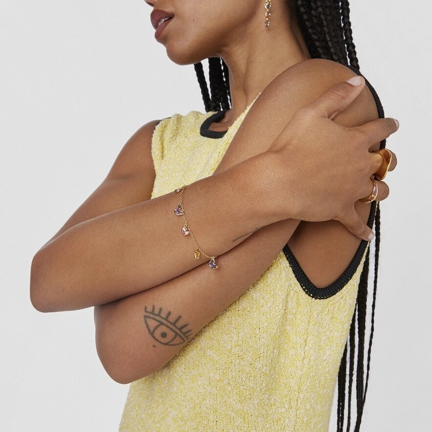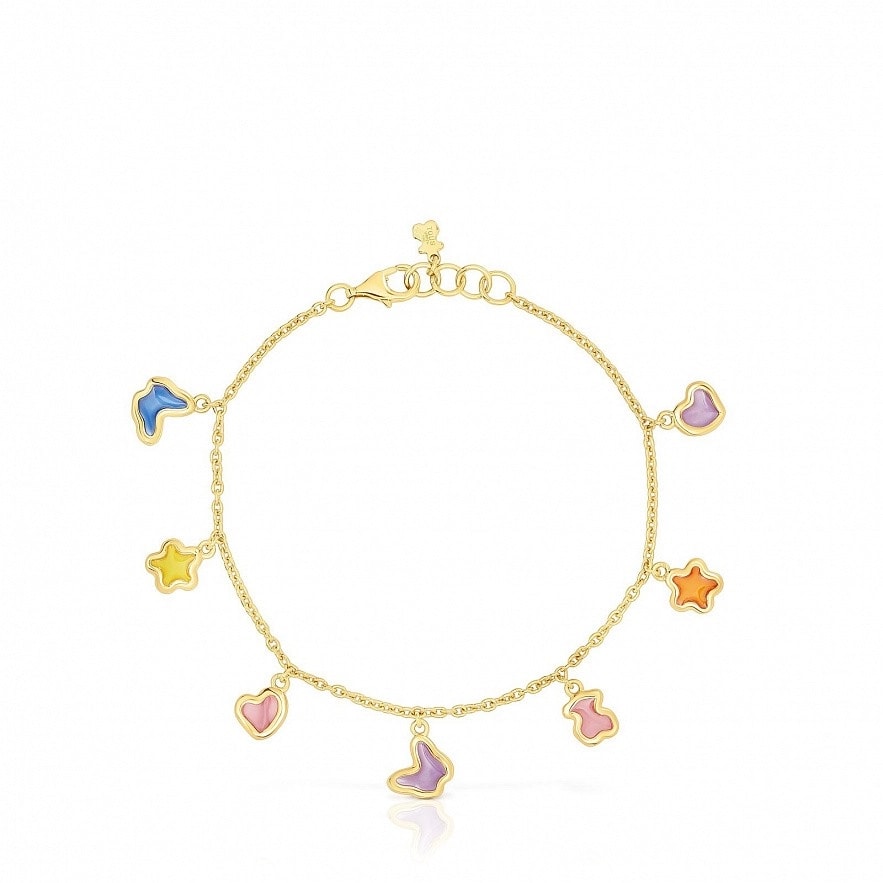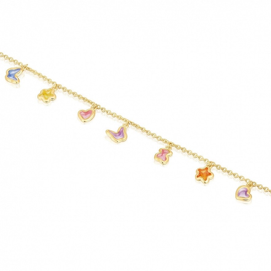 Браслет TOUS Gregal зі срібла 925 проби з покриттям Vermeil та сімома мотивами: із жовтою, оранжевою, рожевою, блакитною та бузковою емаллю. Розміри мотивів: метелик 7 х 8,3 мм, ведмедик 7 х 5,9 мм, квітка 7 х 7,2 мм і серце 7 х 6,4 мм. Довжина браслета: 17,5см. Застібка-лобстер.