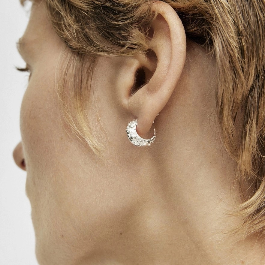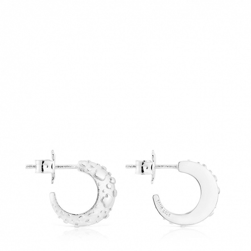 Сережки TOUS Dybe зі срібла 925 проби випуклої форми. Розмір сережок: 14х4 мм. Внутрішній діаметр: 9 мм. Застібка-пусет