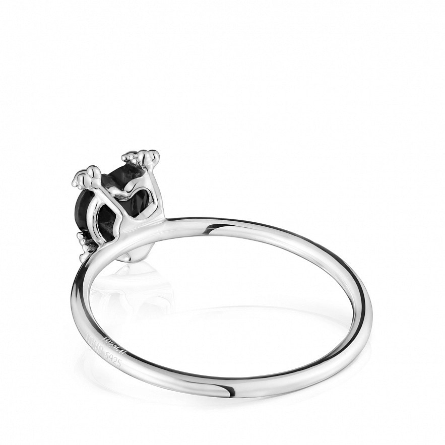 Каблучка TOUS Color Pills із срібла 925 проби та гранованого оніксу у формі серця. Розмір дорогоцінного каменю: 6,2 х 5,8 мм. Розмір ведмедика: 2,4 мм. Висота мотиву: 4,8 мм. Товщина каблучки: 1,25 мм.