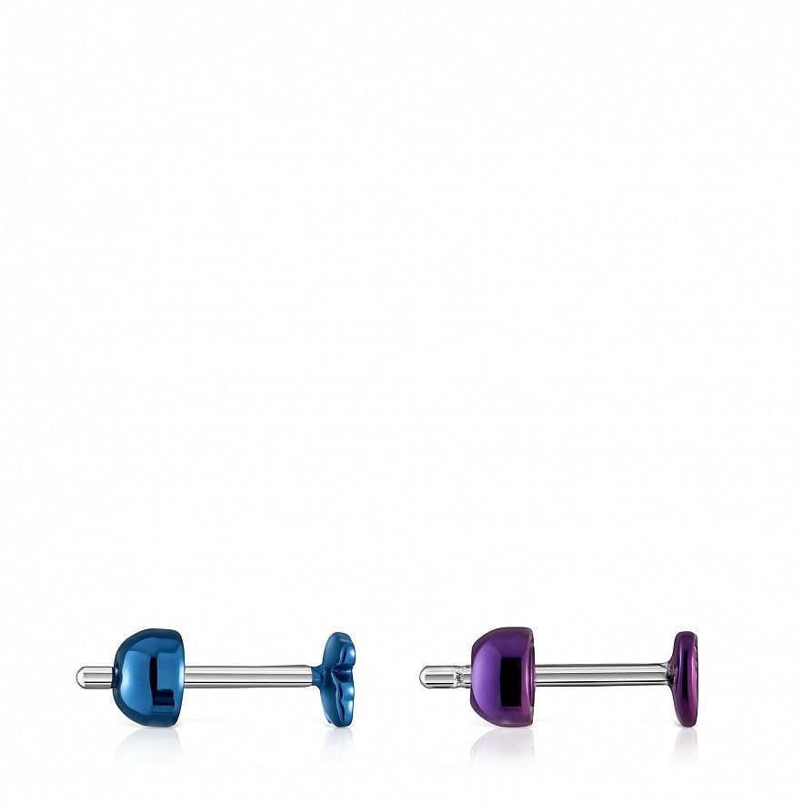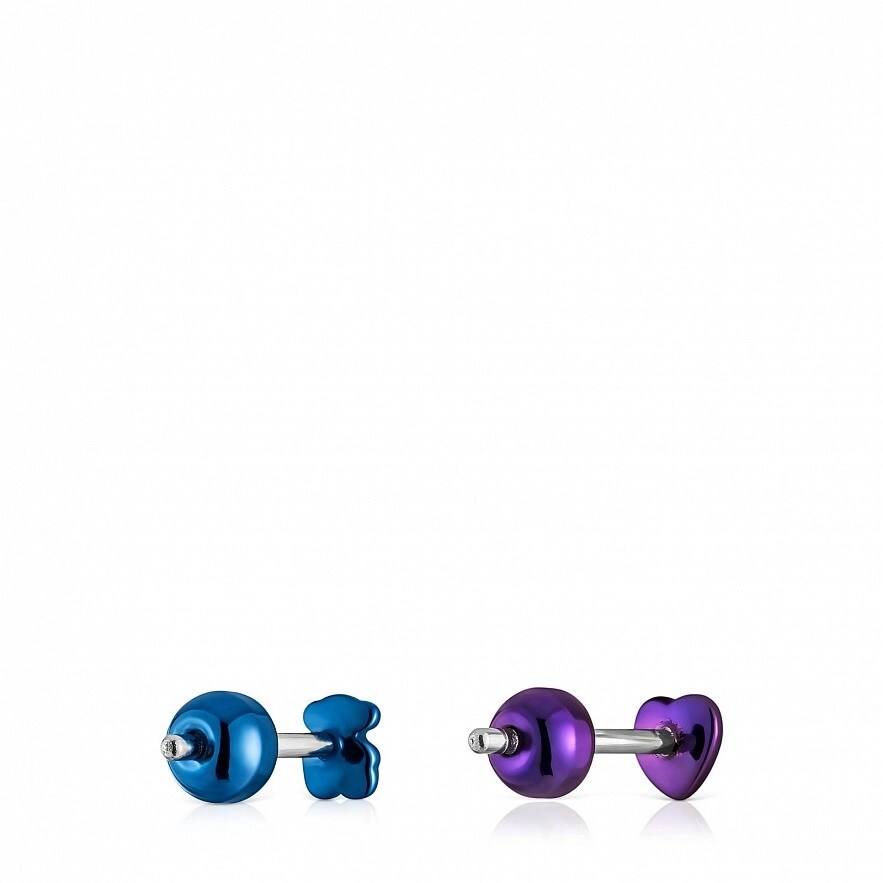 Набір з двох пірсингів для вух TOUS Bickie із фіолетової IP-сталі з сердечком і синьої IP-сталі з ведмедиком. Довжина стрижня: 10мм. Застібка-пусет.